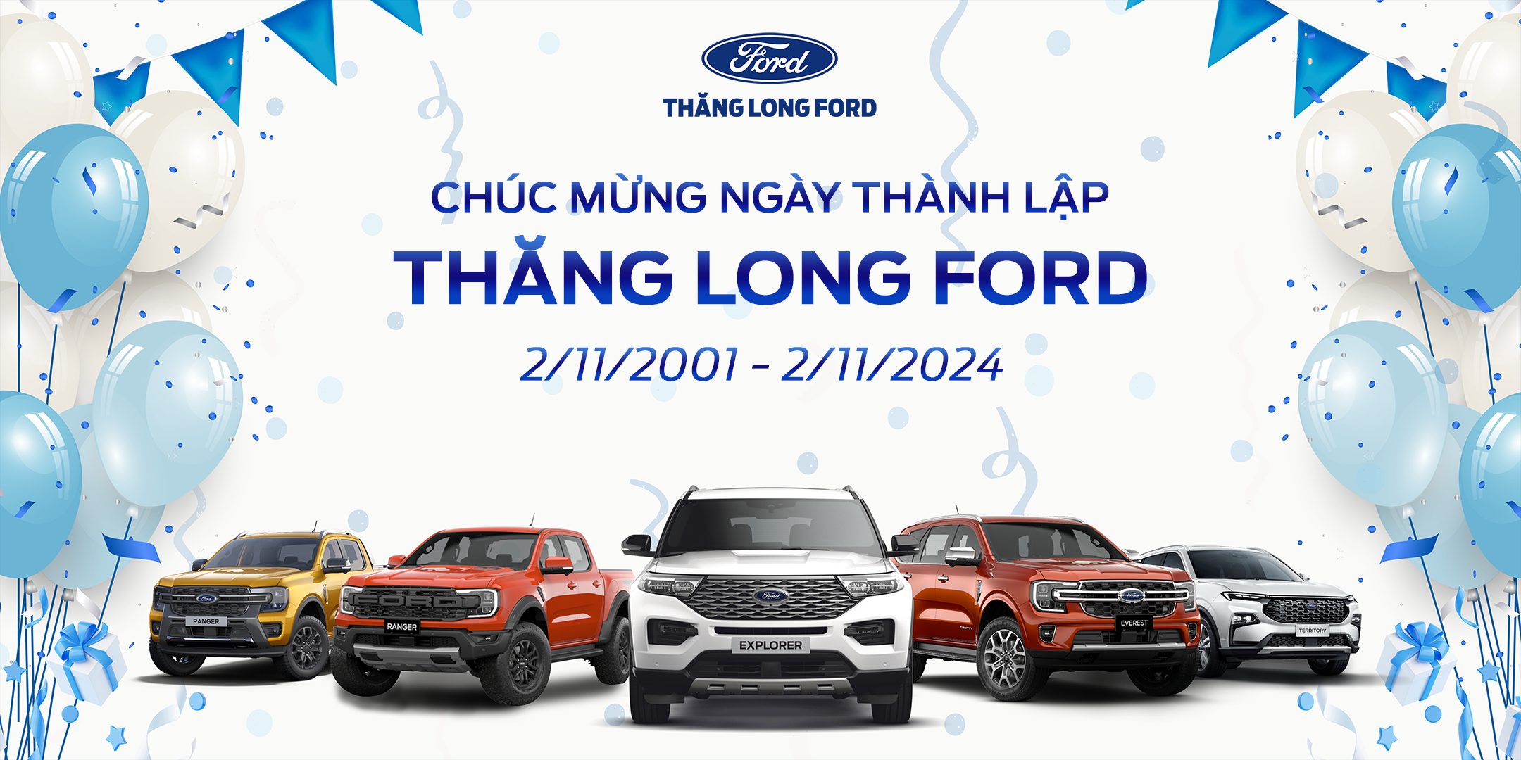Ngày 02/11/2001, Thăng Long Ford chính thức trở thành Đại lý uỷ quyền của Ford Việt Nam. Nhìn lại hành trình 23 năm phát triển Thăng Long Ford cảm thấy trân trọng và biết ơn sự đồng hành của Quý Khách hàng, đối tác và toàn bộ CBNV đã luôn đặt niềm tin và đồng hành cùng Đại lý.