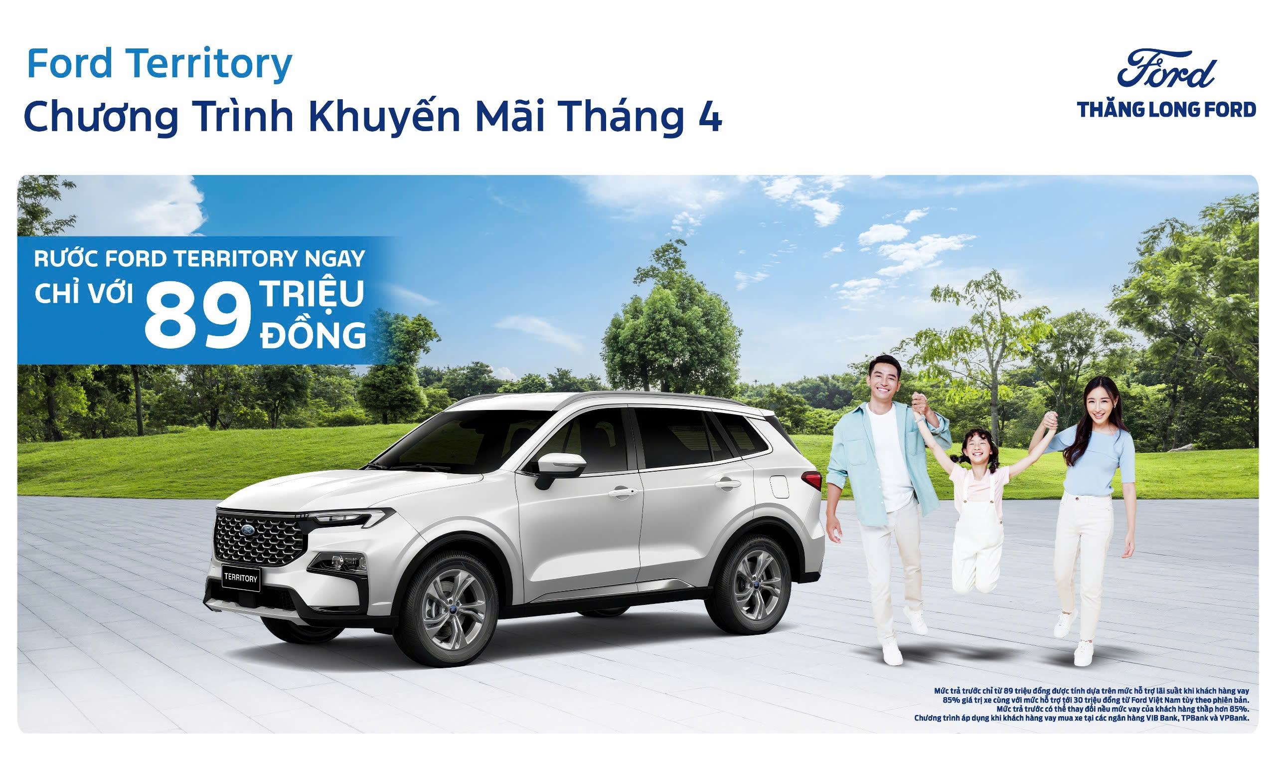 Từ 𝟎𝟏/𝟎𝟒 – 𝟑𝟎/𝟎𝟒/𝟐𝟎𝟐𝟓 khi mua Ford Territory khách hàng sẽ được hỗ trợ TÀI CHÍNH đến 30 TRIỆU ĐỒNG khi vay qua ngân hàng đối tác. Đặc biệt trả trước chỉ từ 89 TRIỆU ĐỒNG với lãi suất ưu đãi CỰC THẤP – từ 7,5%/năm (VIB, TPBank, VPBank)
